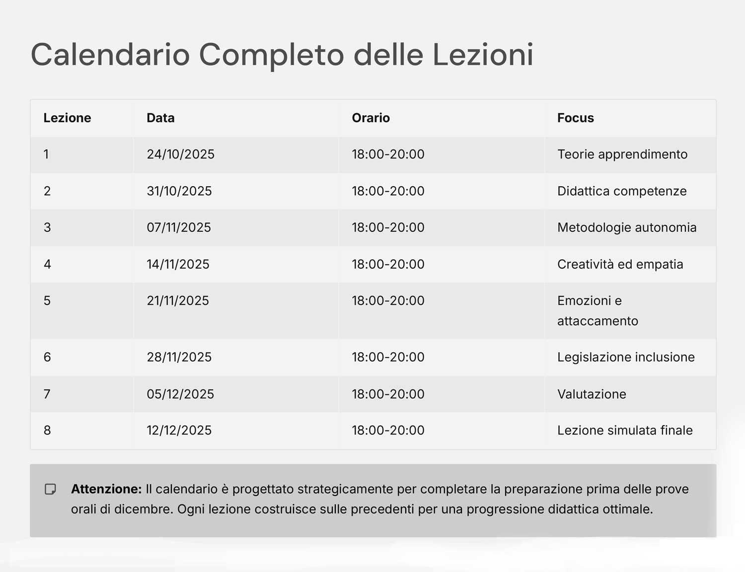 Il corso si compone di 8 lezioni in diretta online, ciascuna della durata di 2 ore, tenute dal docente ogni venerdì dalle 18:00 alle 20:00, dal 24 ottobre al 12 dicembre 2025. Ogni incontro segue una struttura didattica ottimizzata per favorire l'apprendimento: